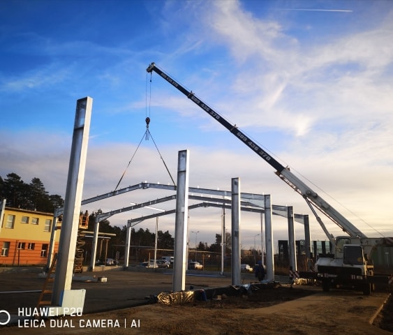 Do zamodelowania części stalowej o wymiarach 21.8 m x 38.8 m wykorzystano program Virtual Steel. W projekcie użyto również ramy portalowe z profili dwuteowych gorącowalcowanych (IPE360 i IPE450) oraz zimnogięte płatwie o przekroju poprzecznym Z.