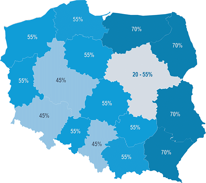 Wielkość refinansowania uzależniona jest od lokalizacji (a dokładniej województwa), w którym zostanie wdrożona innowacja. Podane wartości obowiązują dla mikro i małych przedsiębiorstw. Wielkość refinansowania dla średnich przedsiębiorców jest niższa o 10 punktów procentowych odpowiednio dla każdego województwa.